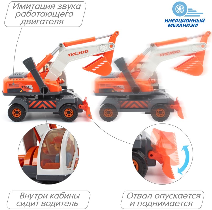 Кабина колесного экскаватора делает оборот на 360 градусов: нажмите на рычаг сбоку, чтобы отрегулировать работу ковша и степень наклона стрелы для сбора сыпучих материалов. Внутри машины установлен фрикционный механизм (инерционный механизм разгона): толкните машину вперед, и она поедет, издавая звуки работающего двигателя. Экскаватор оснащен отвалом, который можно опускать и поднимать, а внутри кабины сидит водитель.