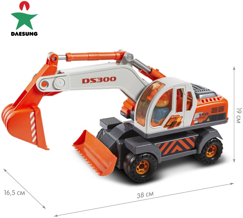 Игрушка Колесный экскаватор Дасунг длиной 38 см имеет вращающуюся кабину, рычаг для управления ковшом и фигурку водителя внутри (не вынимается).
