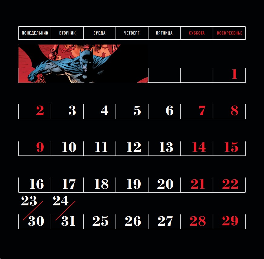 Оставить отзывКалендарь с 12 самыми эпичными артами Бэтмена! Отличное полиграфическое исполнение и удобная сетка, в которой отмечены все государственные праздники – все это будет дарить вам такие незабываемые эмоции каждый день, что вы не заметите, как пролетит целый год! Отличный подарок себе и друзьям!