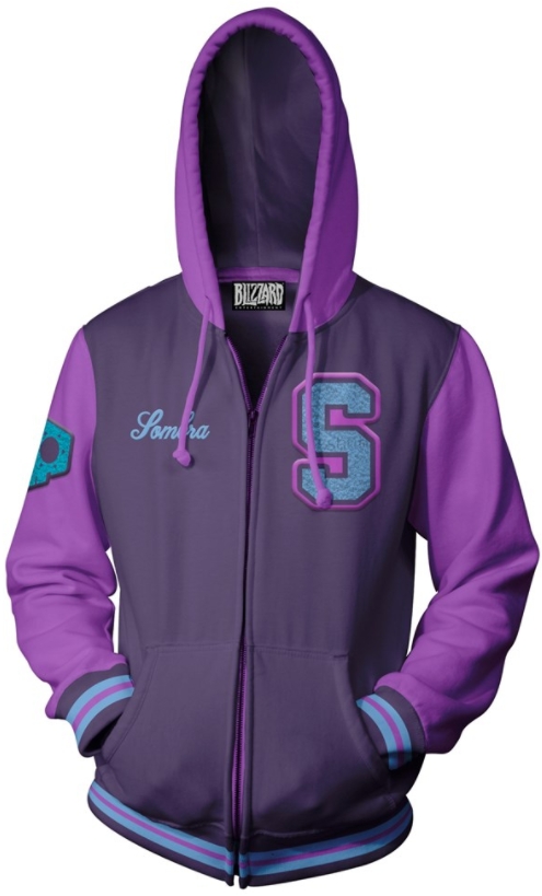 Худи на молнии Overwatch: Sombra выполнено в фиолетовом цвете с нанесенными символами универсального героя Сомбры по мотивам многопользовательской компьютерной игры в жанре шутера от первого лица Overwatch.