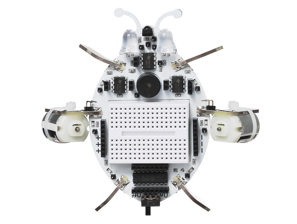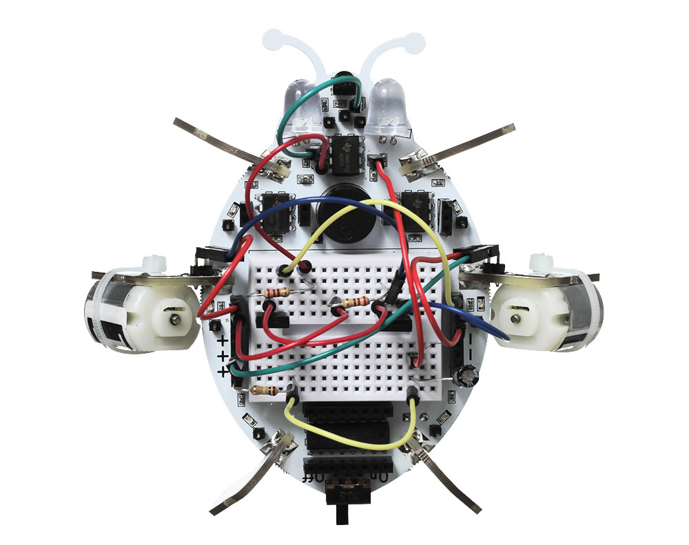 Жук научится пищать, мигать светодиодами и реагировать на пульт управления телевизором. Для сборки робота не нужен компьютер, программировать не придётся. Вся логика задаётся схемой соединения компонентов.