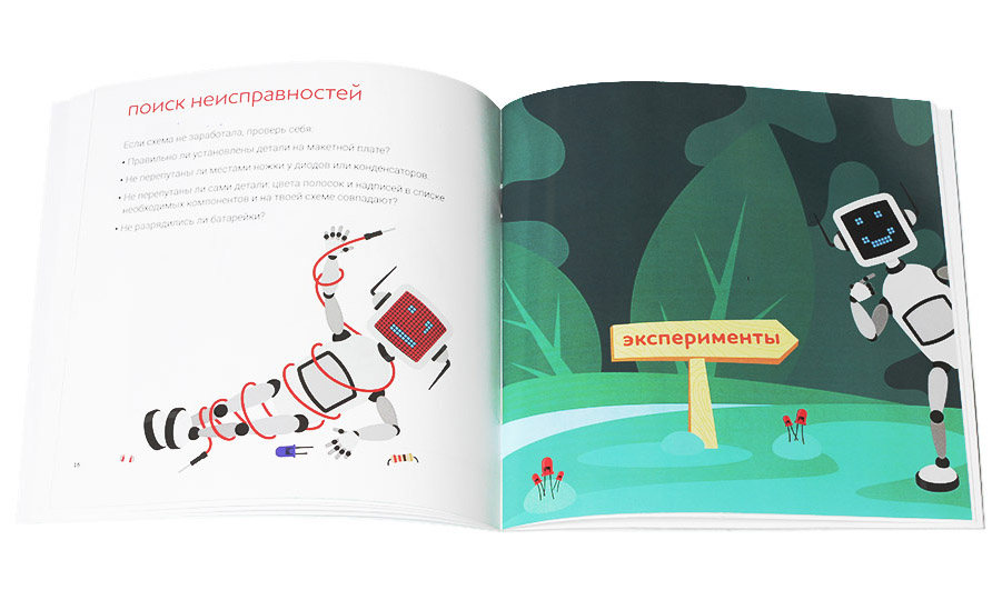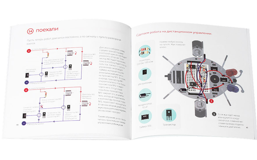 Подробные схемы, инструкции по сборке и лаконичное описание принципов работы электронных деталей мы собрали в красочный буклет. Минимум сухой теории, максимум движения и действия.