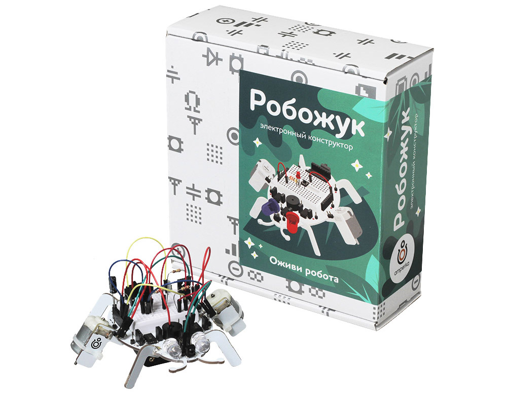Электронный конструктор Робожук откроет мир робототехники восьмилетним инженерам. 14 увлекательных экспериментов со светом, звуком и движением познакомят ребёнка с азами схемотехники.