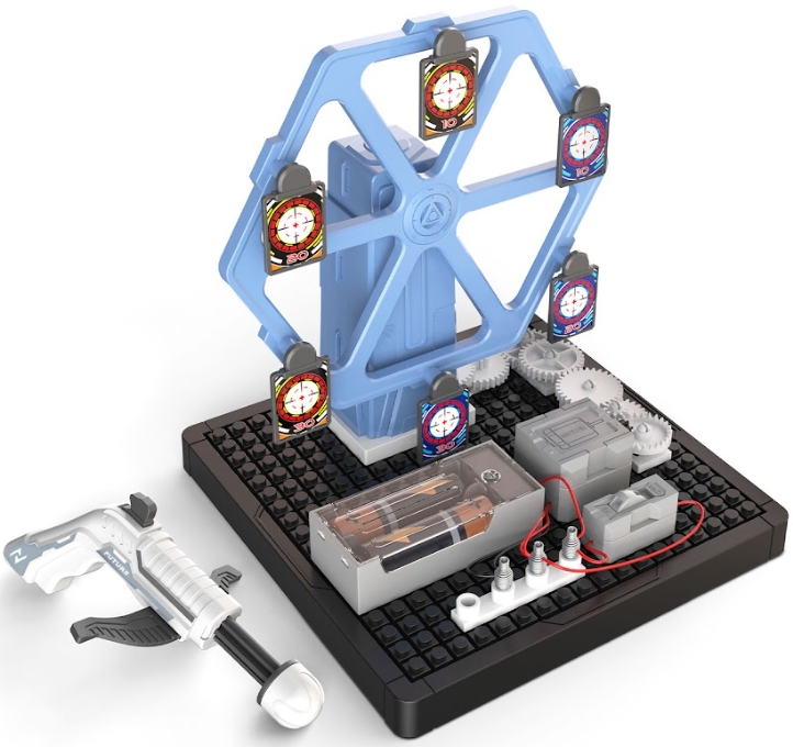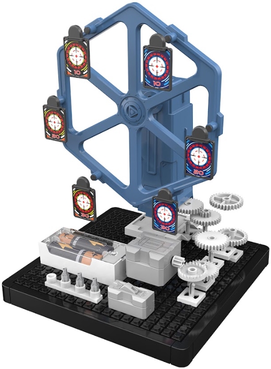 - Вращающийся механизм с 6 мишенями на магнитах приводится в движение с помощью мотора, преобразующего электроэнергию в механическую работу.