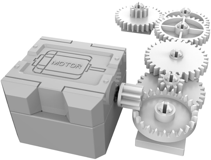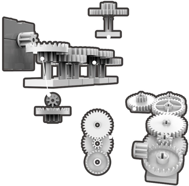 После сборки конструктора активируйте движения, установив на макетную плату электрическую цепь. В качестве источника энергии используйте 2 батарейки типа АА. За преобразование крутящего момента отвечают 10 шестерней в ступенчатой коробке передач