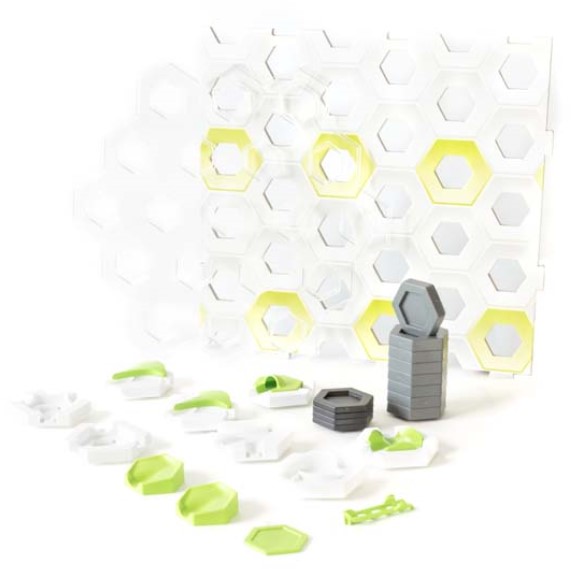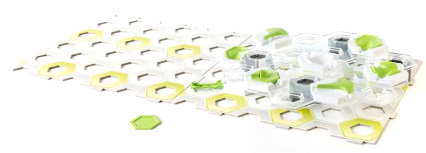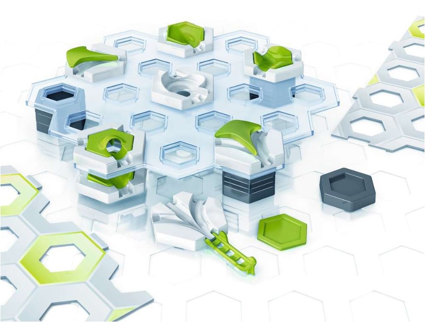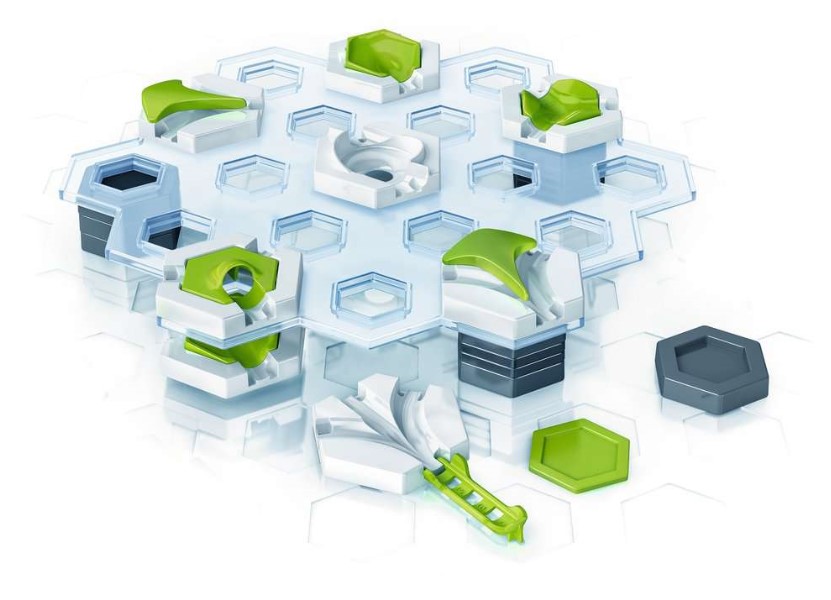 В конструкторе GraviTrax: Здание ребенок может увеличить гоночный путь для шариков благодаря платформам и другим строительным элементам, а также создавать еще более сложные треки и продлевать дорогу к финишу.