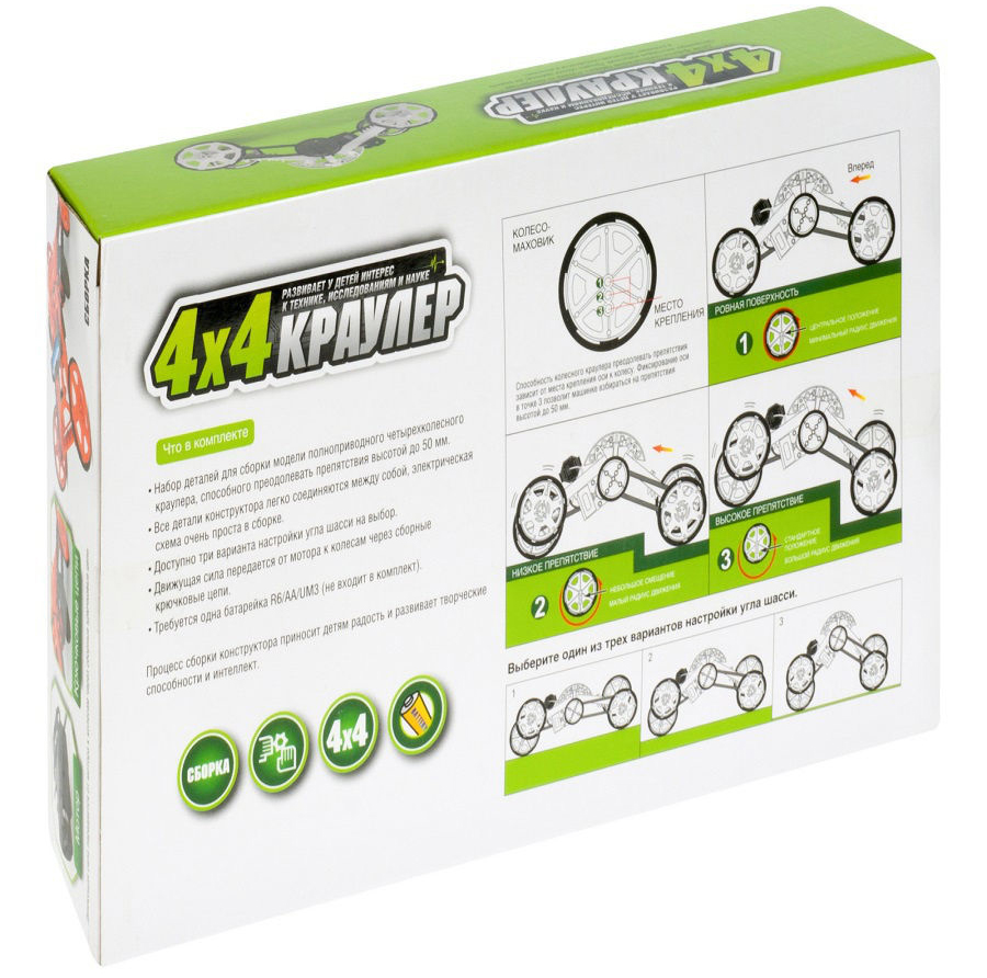 Соберите свой краулер 4Х4! Играть с ним увлекательно и весело! Изменяя положение колес, можно увеличивать или уменьшать способность краулера преодолевать препятствия.
