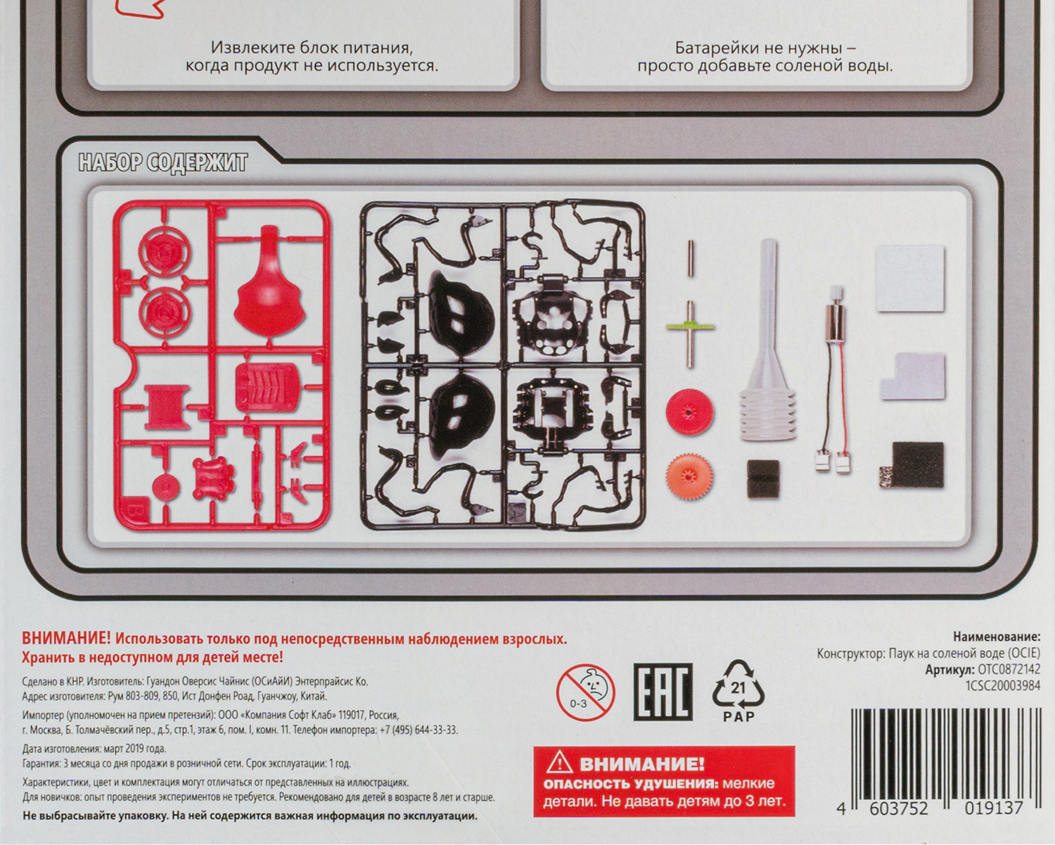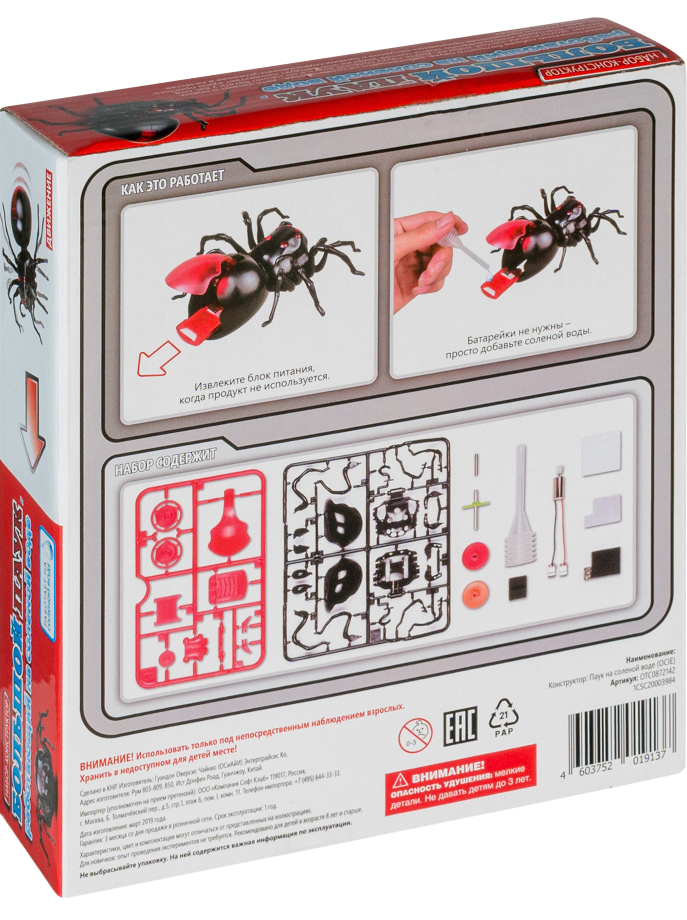 Дети получат множество впечатлений от этого жуткого чудища, сборка которого не требует особых усилий. Добавив водно-солевой раствор в блок питания, вы сможете запустить паука, а благодаря магниевой металлической пластине он сможет без перерыва работать 4-6 часов подряд (в набор входит 3 таких пластины). Паук настолько реалистичен, что, возможно, вам захочется выключить его. Это очень легко сделать – просто извлеките блок питания, промойте его водой и высушите. Все материалы, используемые в этом наборе, являются экологически безопасными и чистыми, не содержат токсичных веществ или вредных отходов.
