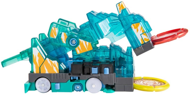 Машинка-трансформер разгоняется, ловит два специальных диска один за другим, делает кувырок и самостоятельно трансформируется прямо в воздухе.