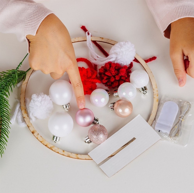 В этом наборе вы найдете все необходимое, чтобы создать красивый новогодний декор для дома. Прикрепите к деревянному кругу еловые ветки, елочные игрушки, мягкие помпоны и гирлянду – и украшение готово! Кстати, помпоны вы тоже сделаете сами с помощью специальной заготовки. В наборе есть подробная инструкция.