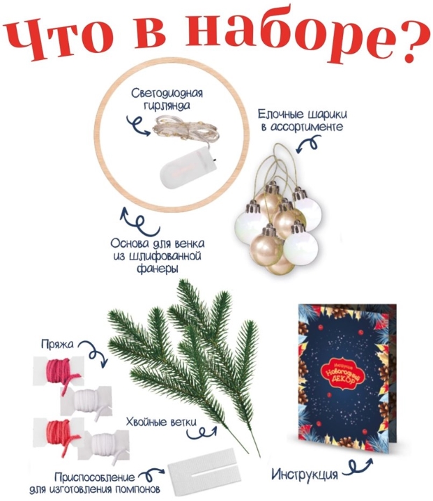 В этом наборе вы найдете все необходимое, чтобы создать красивый новогодний декор для дома. Прикрепите к деревянному кругу еловые ветки, елочные игрушки, мягкие помпоны и гирлянду – и украшение готово! Кстати, помпоны вы тоже сделаете сами...