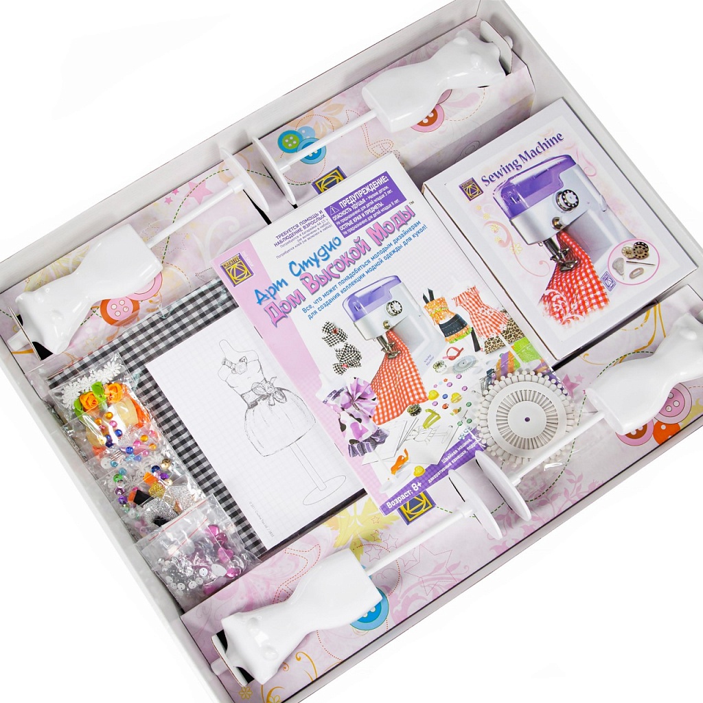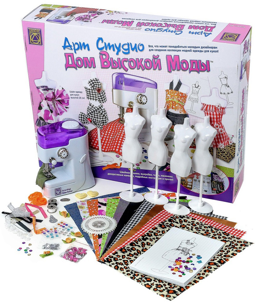 В комплект входит настоящая швейная машинка, манекены, эскизы, выкройки и все, что потребуется для творческой работы кутюрье.