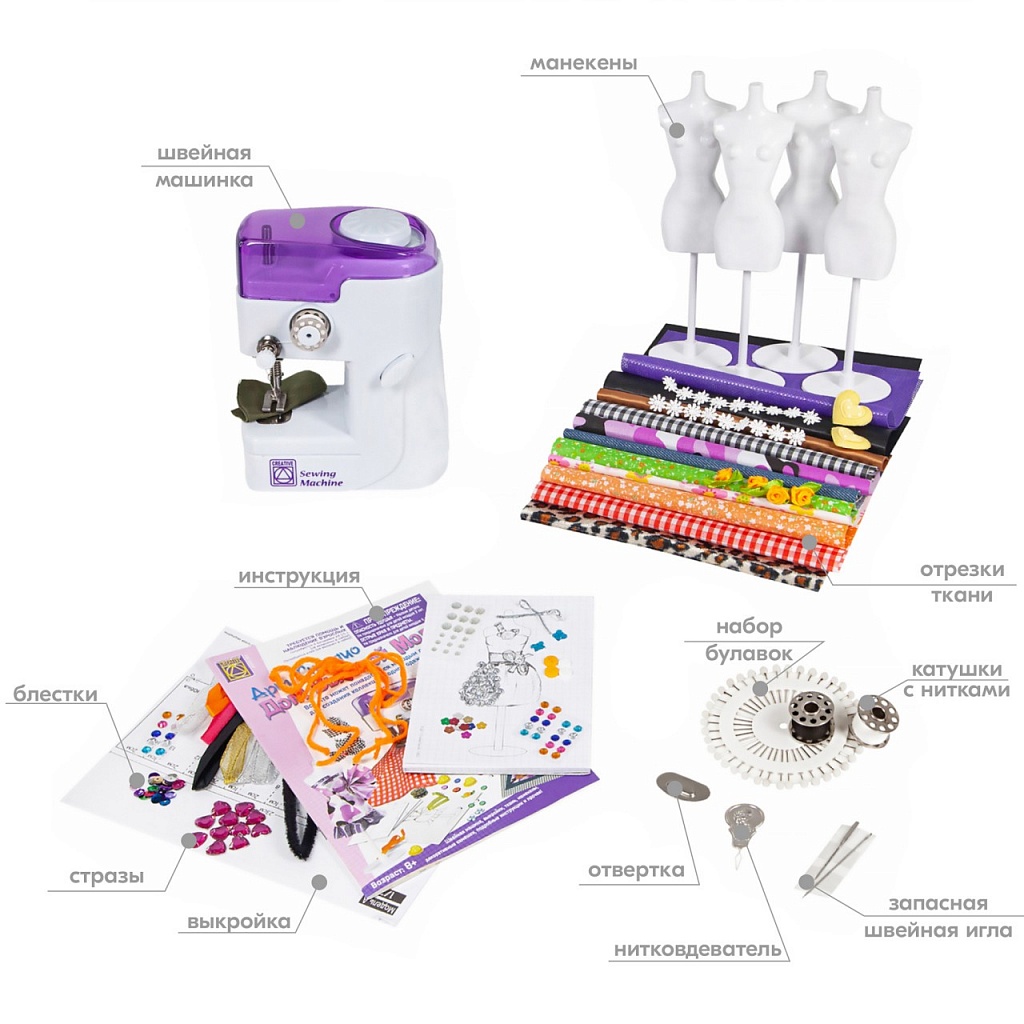 - Шитье. Когда все детали дизайнерского наряда готовы, соедините их и сшейте между собой, используя швейную машинку или нитку с иголкой. Кстати, машинкой из набора можно сшивать ткани любой плотности. Готовый наряд примерьте на манекен или на вашу любимую куклу.