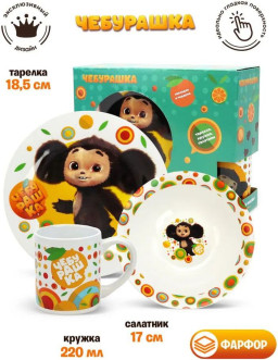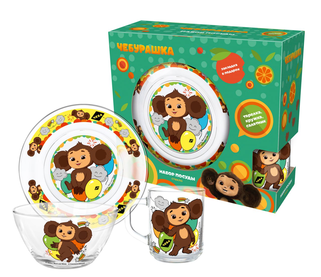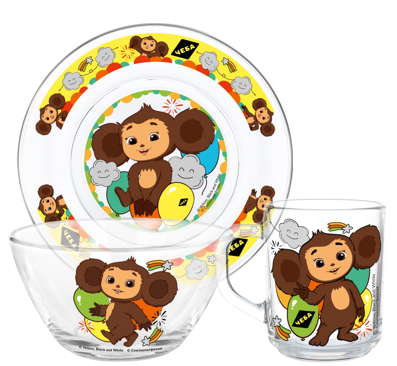 Набор посуды «Чебурашка» – чудесный набор посуды с любимым героем советских и современных мультфильмов. Детская посуда изготовлена из стекла, подходит для горячих и холодных блюд и напитков. Набор детской посуды состоит из 3 предметов: обеденной тарелки, салатника и кружки.