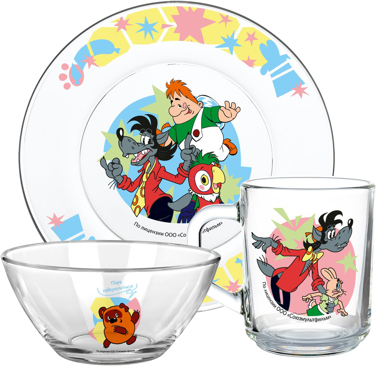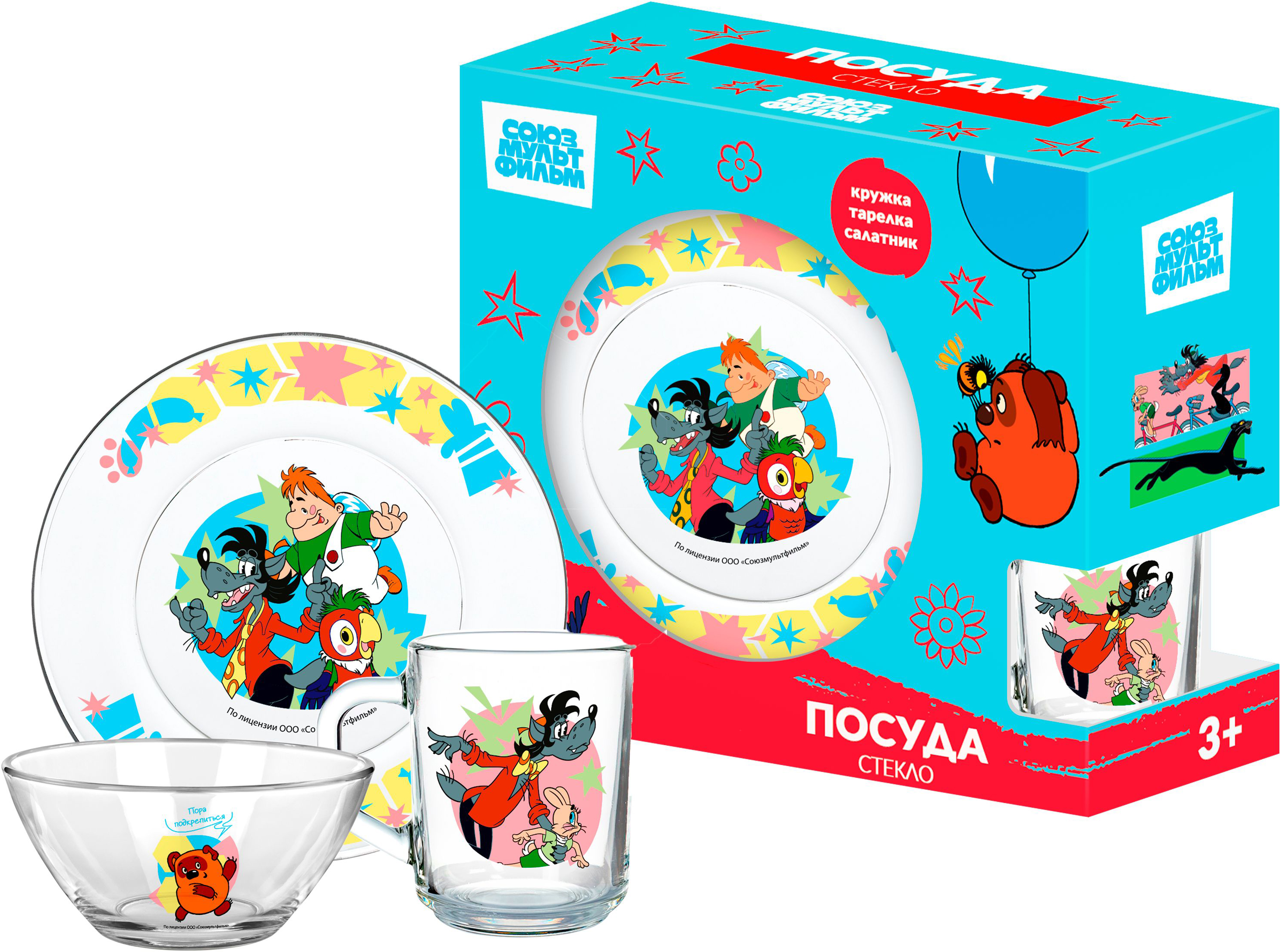 Посуда выполнена из прозрачного стекла – она выглядит аккуратно и легко вписывается в повседневную сервировку. Тарелка подойдёт для основных блюд и перекусов, салатник – для фруктов, каш и десертов, а кружка удобна для чая, компота или какао. Рисунки яркие, хорошо читаемые и долго сохраняют внешний вид при правильном уходе.