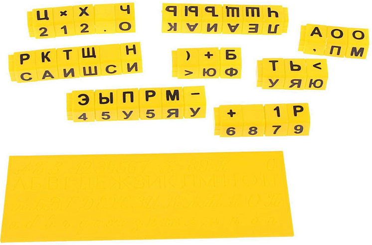 - Тренажер для письма – пластина, которая содержит кассу элементов букв и соединений, 30 печатных букв, 58 прописных и строчных букв для классического (поэлементного) и безотрывного письма, 10 цифр.