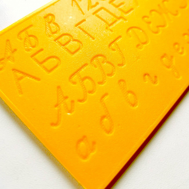 Тренажёр для обучения письму – это пластина, на обе стороны которой нанесены буквы, их элементы и цифры. Все знаки содержат сенсорные дорожки с рельефным дном. Использование тренажёра при обучении ускоряет овладение письмом в 2,5-3 раза по сравнению с обычным методом многократного переписывания букв.
