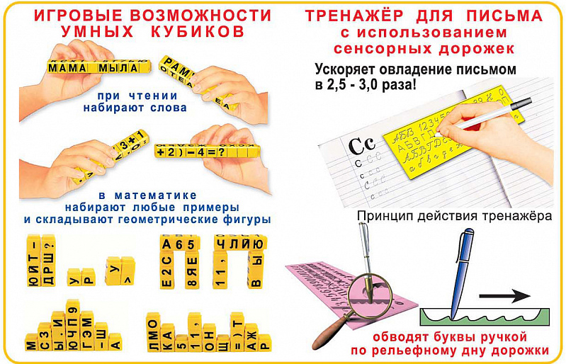 Оставить отзывТренажёр для обучения письму – это пластина, на обе стороны которой нанесены буквы, их элементы и цифры. Все знаки содержат сенсорные дорожки с рельефным дном. Умные Кубики – это специальные элементы в форме соединяющихся кубиков, на которые нанесены все буквы алфавита, знаки препинания и математические знаки, изучаемые детьми до 9 лет.