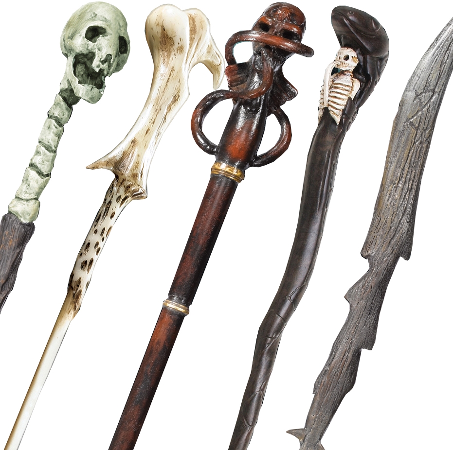 Палочка Лорда Волан-де-Морта выглядит так, как будто она вырезана из кости, а палочки Пожирателей Смерти имеют устрашающие наконечники на ручке в виде – черепа, темной метки в насыщенных тонах красного дерева, змеиной головы со скелетом и похожего на коготь злого шипа. Палочки располагаются на держателе в виде «Темной метки» – черепа со змеей вместо языка, свернувшейся в виде восьмерки.