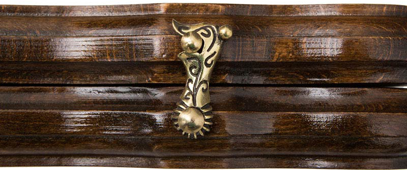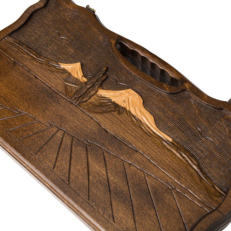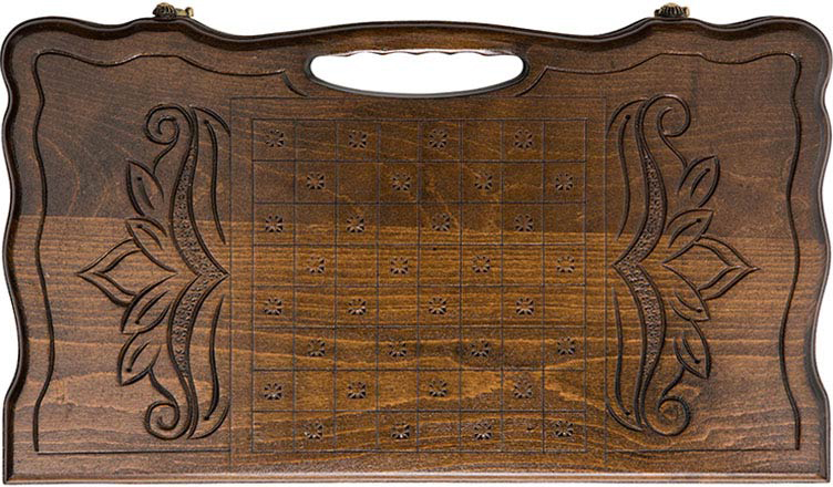 Резные нарды, выполненные известным мастером из Армении – Кареном Халеяном. Весь корпус выполнен вручную, что делает их уникальными и гарантирует максимально высокое качество исполнения. Это самый крупный размер из других представленных – длинная грань чуть больше 50 см. Мастер предусмотрел всё, поэтому здесь есть изысканно вырезанная ручка, которая позволит удобно их переносить. Сами нарды изготовлены из бука, что гарантирует их высокую прочность и очень долгий срок службы, а петли и крючки – из натуральной бронзы.