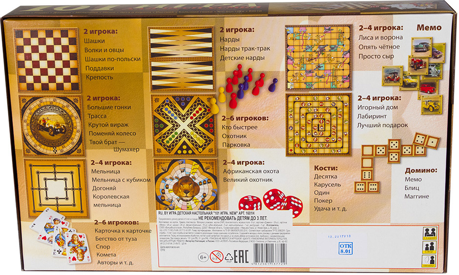 Оставить отзывНастольная игра 101 игра для всей семьи содержит материал для 101 игры, рассчитанных на игроков старше пяти лет. В комплект входит 4 игровых поля, комплект шашек-шахмат, домино, игральные карты.