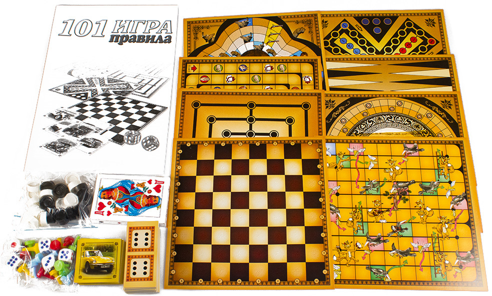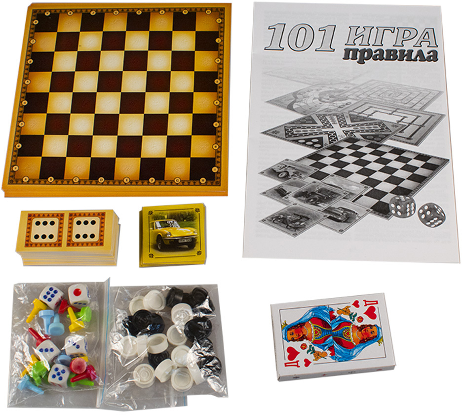 Настольная игра 101 игра для всей семьи содержит материал для 101 игры, рассчитанных на игроков старше пяти лет. В комплект входит 4 игровых поля, комплект шашек-шахмат, домино, игральные карты.