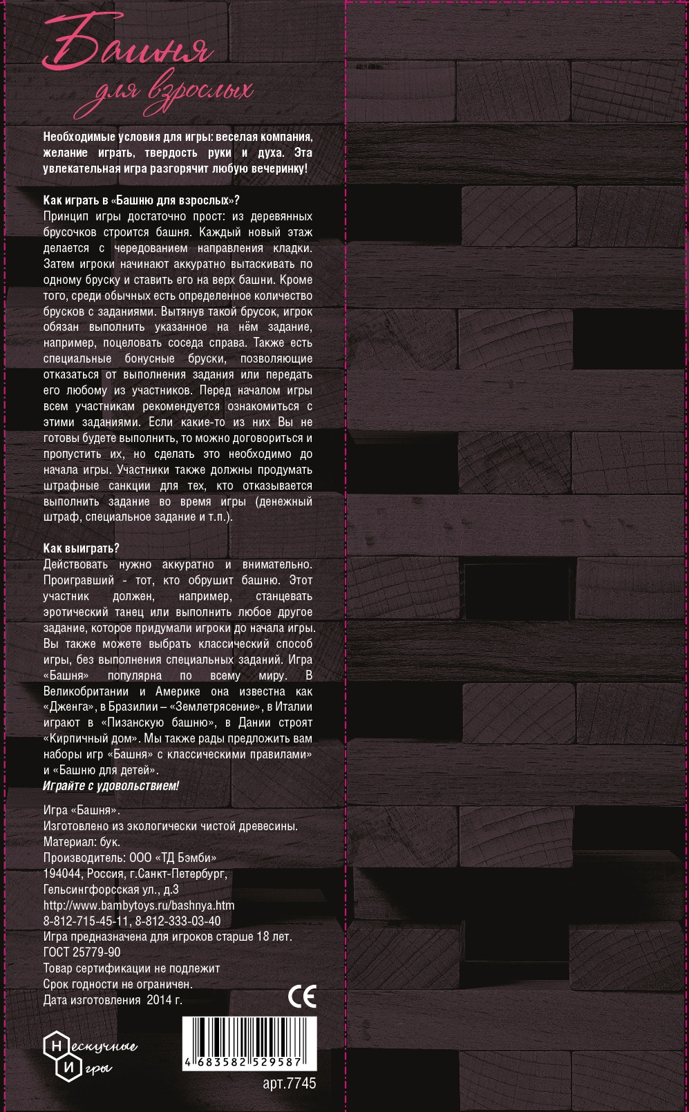 Оставить отзывБашня это увлекательная настольная игра. Принцип достаточно прост: из ровных деревянных брусков строится башня (каждый новый «этаж» делается с чередованием направления укладки), а затем игроки начинают аккуратно вытаскивать по одному бруску и ставить его на верх башни.
