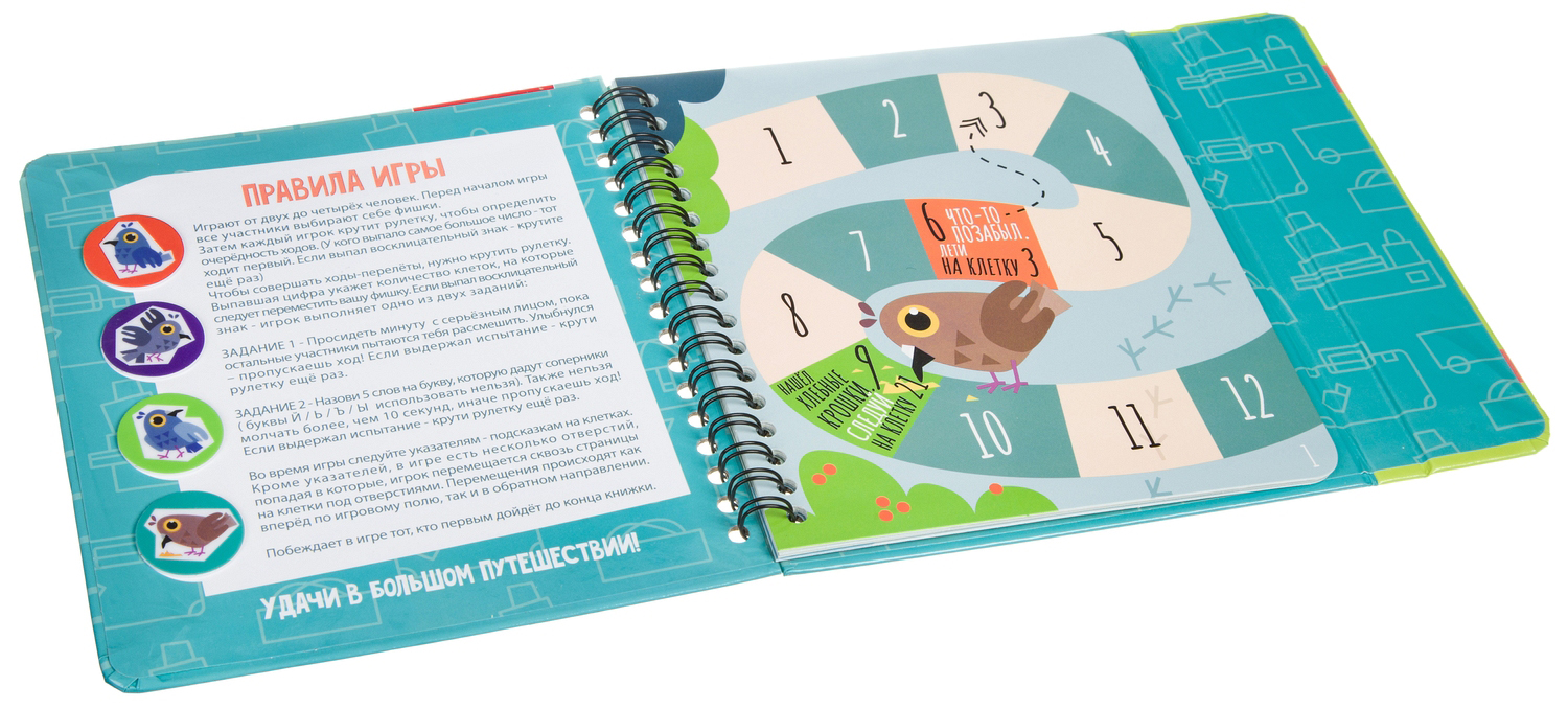 В комплект игры входят: игровое поле, расположенное на 10 страницах, рулетка со стрелкой для выбора хода, 4 самоклеящиеся многоразовые фишки.