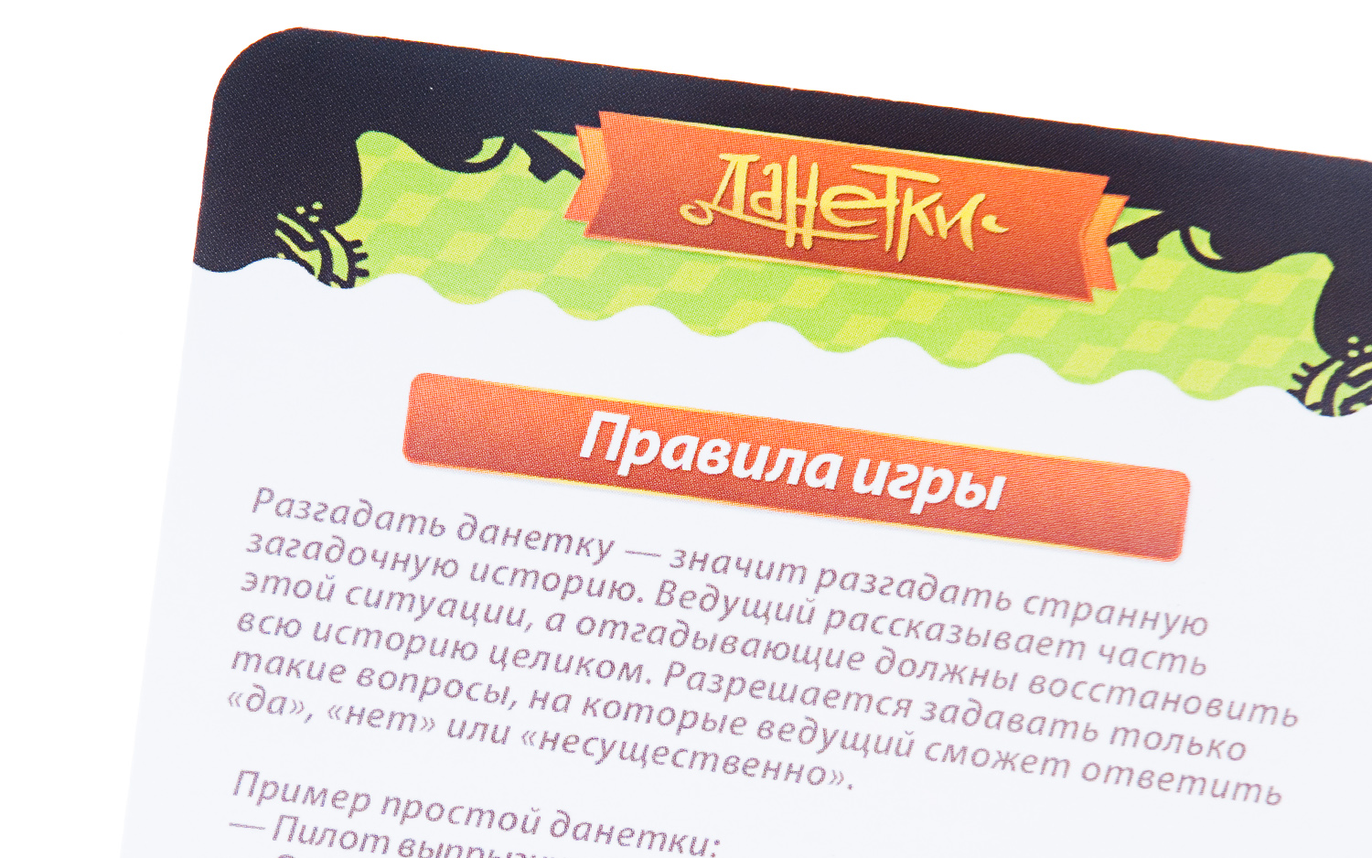 Набор подходит для спортивной игры на очки: на каждой истории указаны ключевые вопросы. В сравнении с наборами классических Данеток в чёрной коробке и детективного набора в оранжевой коробке – самые простые истории. На отгадывание одной истории уходит обычно около 5–7 минут. Можно играть в дороге (даже в машине), хорошо брать в кафе и на вечеринки.