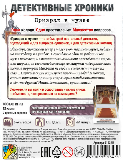 Призрак в музее – это игра-расследование из серии Детективные хроники, в которой предстоит раскрыть тайну загадочных происшествий: правда ли музей захватили призраки или причина исчезновений и прочих странностей кроется в чём-то другом? В этой настольной игре вы столкнётесь с 3D-сценой преступления и со множеством улик, требующих осмысления.