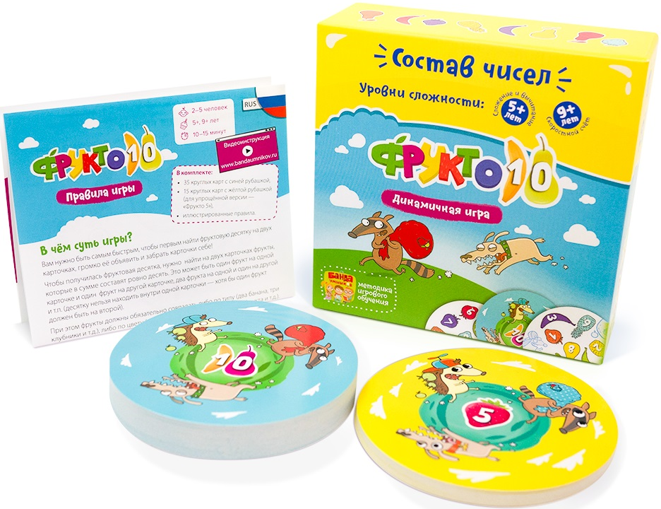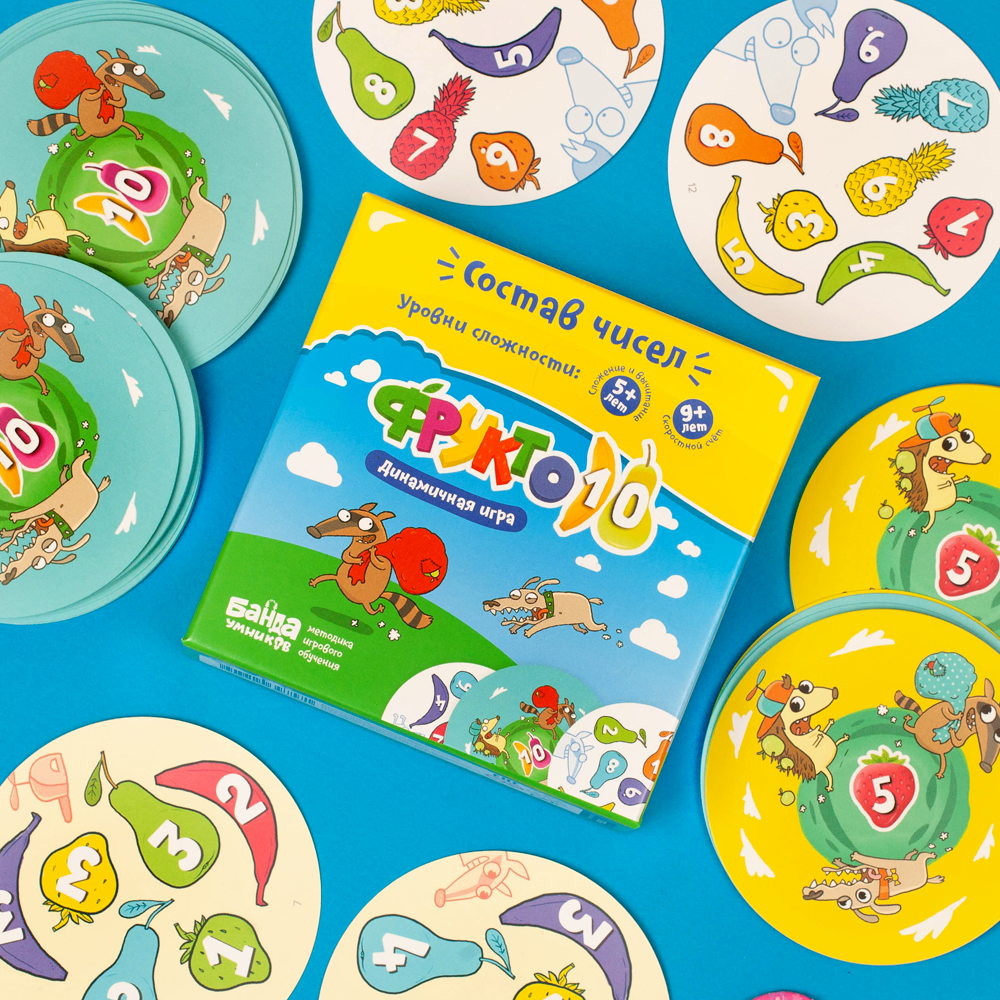В облегченную версию «Фрукто10» можно начинать играть уже с 5 лет. В ней нужно находить одинаковые числа на фруктах одинакового цвета или типа. А в основной версии игры детям предстоит уже не просто искать одинаковые числа, а пары чисел, сумма которых равна 10. Есть и сложные правила, в которых нужно находить максимальную сумму чисел на фруктах определённого цвета или типа.