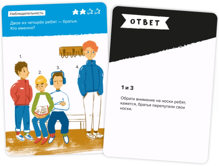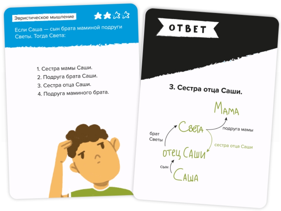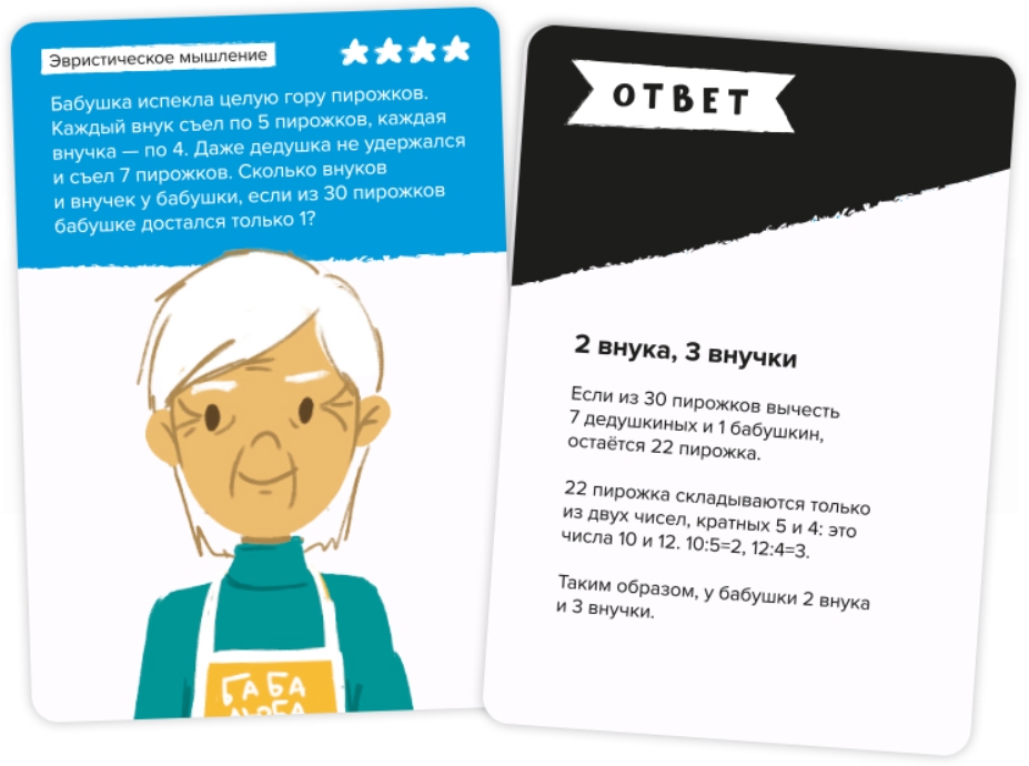 В наборе 80 карточек с заданиями. Каждой из них соответствует свой уровень сложности и основная компетенция, которую развивает данный тип заданий. На обороте карты – ответ с обоснованием решения.