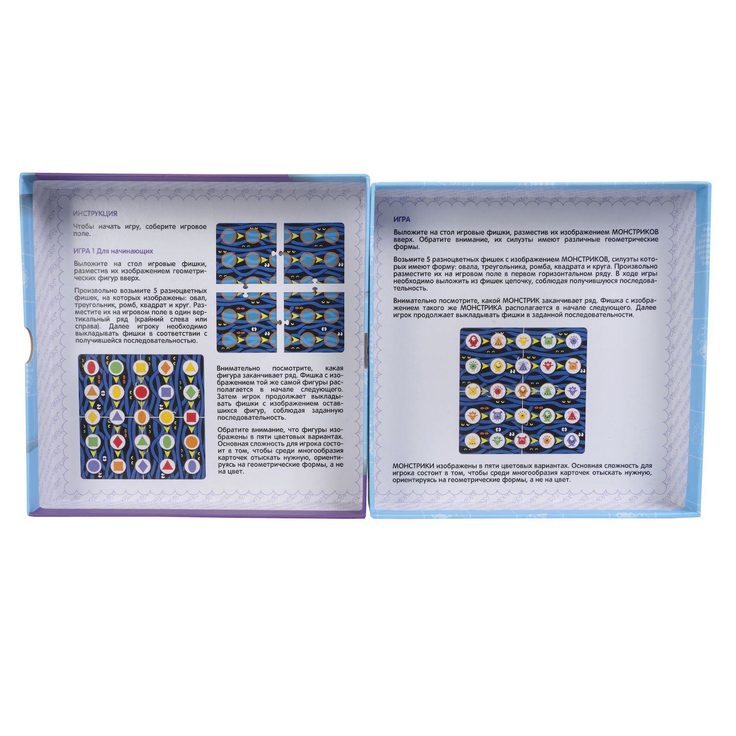 Комплектация настольной игры Играй Думай Учись: Логические цепочки. Монстрики (2в1):