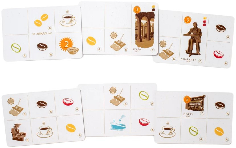 Еще одна хитрость здесь – комбинировать и выкладывать карточки так, чтобы ячейки с одинаковыми действиями граничили друг с другом, и на поле образовывались целые области, которые можно активировать за один раз. Так, например, можно собрать богатый урожай сразу нескольких видов кофейных зерен. А вот сушить их придется отдельно – кубики одного цвета занимают одну ячейку сушки целиком, но серия таких соседних ячеек снова поможет нам оптимизировать производство. То же происходит и с обжаркой. Последний этап – доставка обжаренных зерен на склад или в кофейни, которые, кстати, реально открывались в разные года по всей Португалии: от Фа́ру на юге до округа Виа́на-ду-Каште́лу на севере. Производственный склад готов принять любой кофе, а вот кофейни португальских городов более избирательны, поэтому игроки получают победные очки, только если в конце игры на этих ячейках будут кубики определенных цветов.