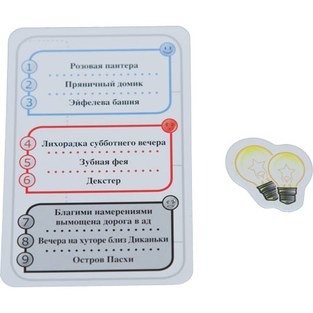 - 110 карт концептов, на каждой из которых по 9 слов (или фраз) трёх уровней сложности (простой, сложный и невероятный)