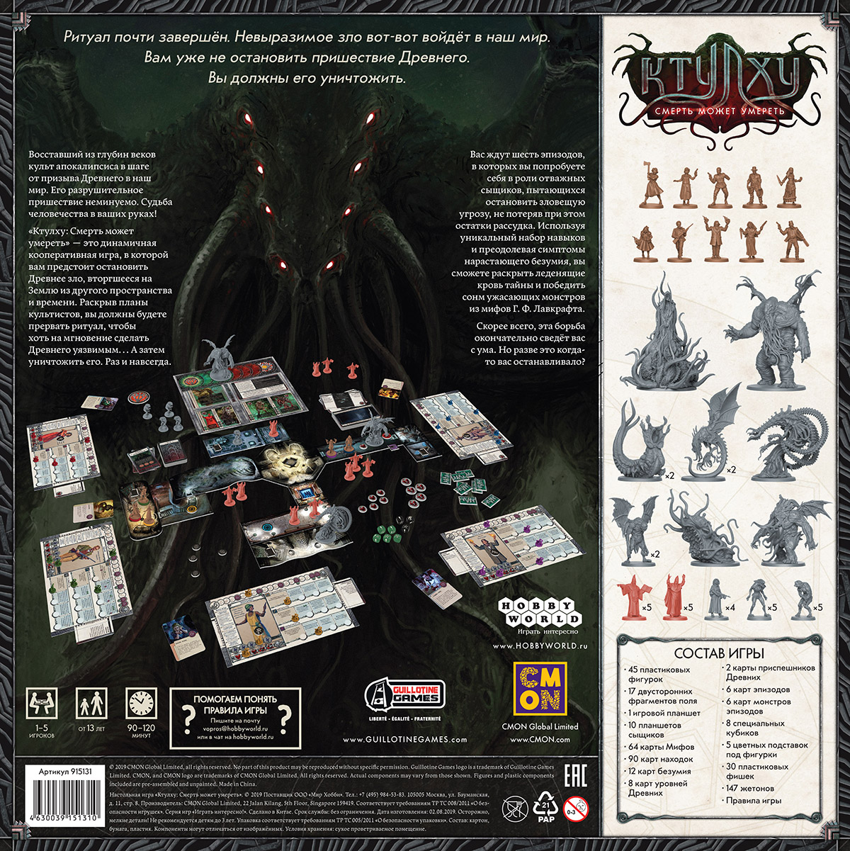 Восставший из глубин веков культ апокалипсиса в шаге от призыва Древнего в наш мир. Его разрушительное пришествие неминуемо. Судьба человечества в ваших руках! «Ктулху: Смерть может умереть» – это динамичная кооперативная игра, в которой вам предстоит остановить Древнее зло, вторгшееся на Землю из другого пространства и времени. Раскрыв планы культистов, вы должны будете прервать ритуал, чтобы хоть на мгновение сделать Древнего уязвимым… А затем уничтожить его. Раз и навсегда.