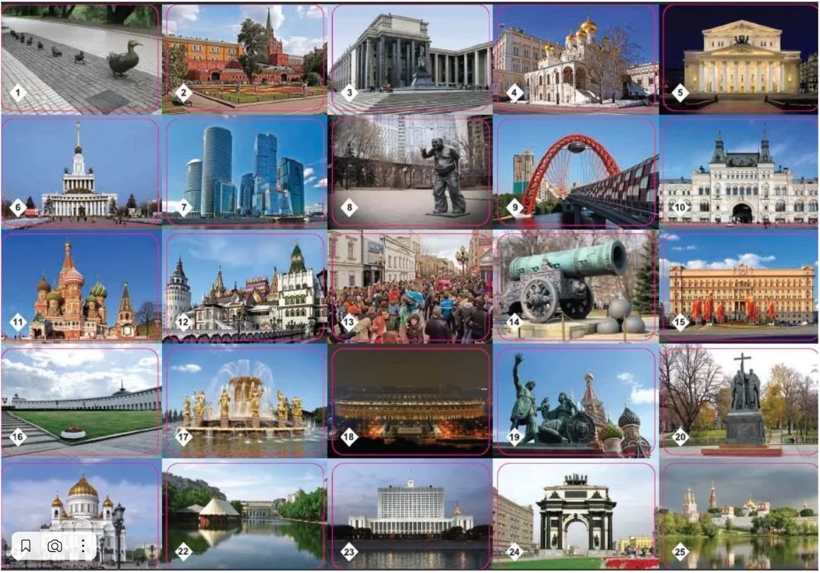 В состав игры входит 2 набора карточек мемо: Москва и Санкт-Петербург. Каждый набор состоит из 50 парных карточек (по 25 пар карточек). На карточках изображены известные места и памятники городов. В состав входят 2 брошюры с описанием мест, изображенных...