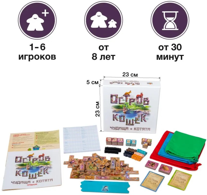 Комплектация настольной игры Остров кошек: Чудища + Котята. Дополнение: