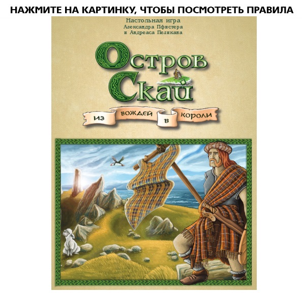В настольной игре Остров Скай вы станете предводителем одного из великих кланов. Продавайте соперникам задорого клочки земли, расширяйте свои владения, разводите стада, возводите маяки на песчаных пляжах. И помните: королём острова Скай может стать только один.