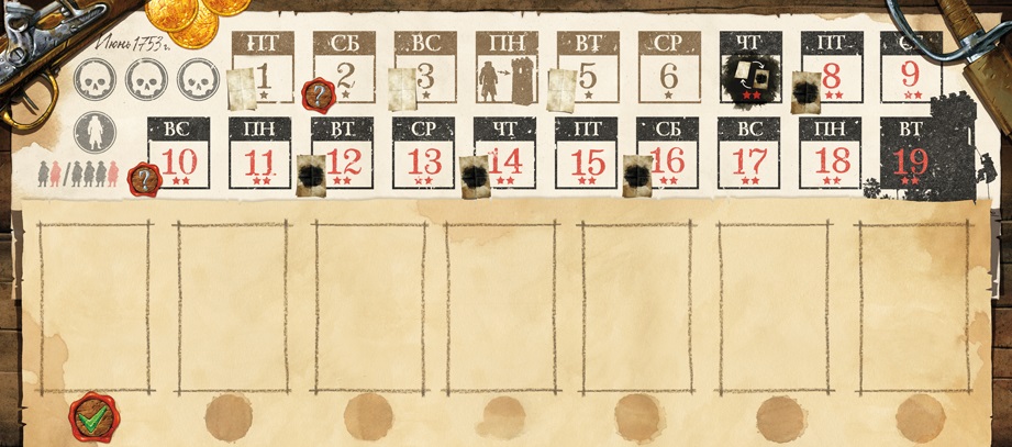 Игровая комплектация чрезвычайно красива и антуражна – внутри вы найдёте красивые ширмы для игроков, прекрасную двухстороннюю карту острова, сундучок, специальные линейки, маркеры, циркуль и многое-многое другое! Ваше путешествие будет по-настоящему ярким и незабываемым!