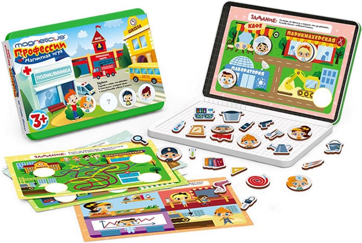 Этот интересный набор разработан для детей дошкольного возраста. Красочные магнитные элементы, а также увлекательные задания неизменно вызовут интерес малыша и помогут с легкостью изучить названия профессий. Набор упакован в удобную металлическую коробку, которую можно взять с собой в любую поездку. С развивающим набором «Профессии» ребенок не заскучает в дороге, в гостях, на даче, с пользой проведёт время, выполняя задания.