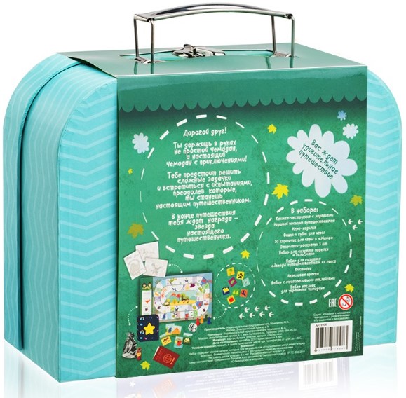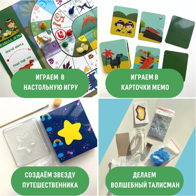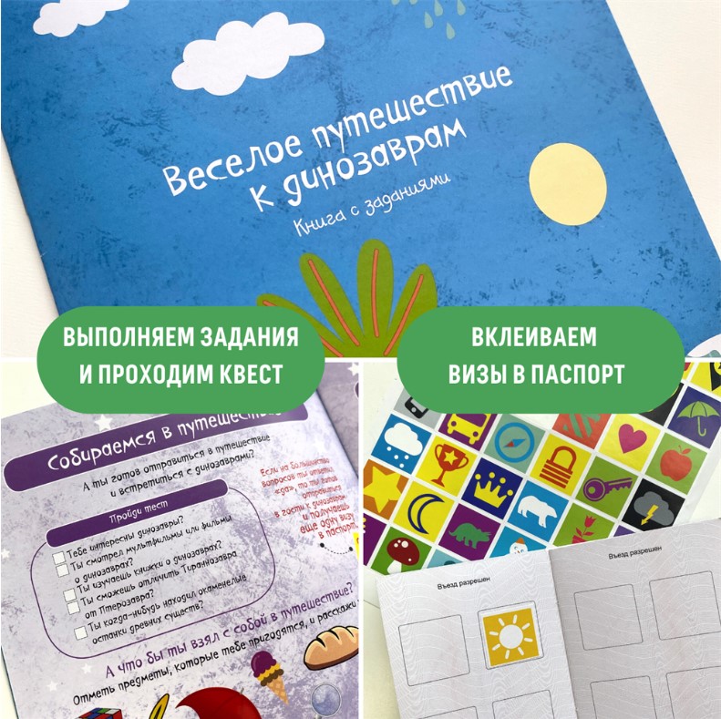 Оставить отзыв«Путешествие к динозаврам» – это игровой набор в формате квеста. Внутри яркого чемоданчика – интересные игры, раскраски, наклейки для украшения чемодана, головоломки и творческие поделки. Перед путешествием не забудьте сделать себе талисман. За каждый пройденный этап наклеивайте визу в паспорт путешественника. Когда выполните все задания, получите приз – звезду настоящего путешественника!