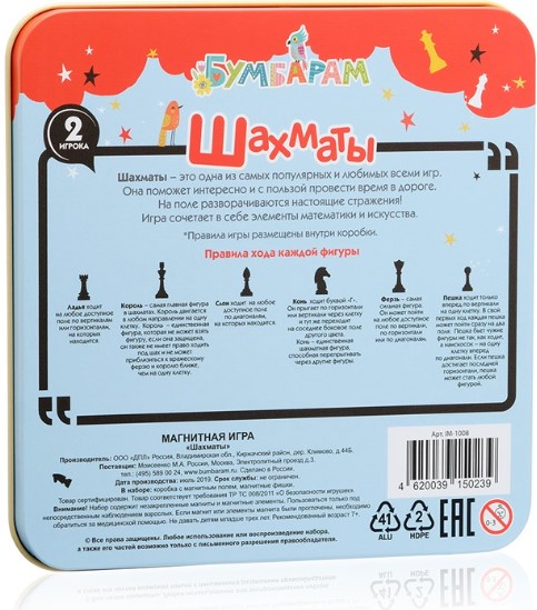 Оставить отзывСамая популярная настольная игра на планете – шахматы! Каждому стоит научиться ее основам, ведь это отличный способ развить стратегическое мышление, логику и память. Воспользуйтесь магнитной игрой «Шахматы», чтобы познакомить ребенка с правилами и секретами шахмат. Она не займет много места в вашем доме, а также легко поместится в любую дорожную сумку.