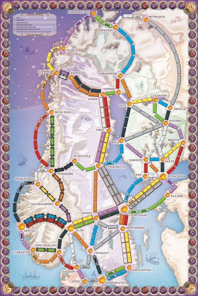 В настольной игре Ticket To Ride: Северные страны вы отправитесь в морозное и увлекательное путешествие по Дании, Финляндии, Норвегии и Швеции. Вы посетите знаменитые северные столицы: Копенгаген, Осло, Хельсинки и Стокгольм. Увидите прекрасные норвежские фьорды и насладитесь завораживающим дух горным пейзажем Лестницы троллей. Вдохнёте солёный запах Балтийского моря в шумных шведских портах. Стрелой промчитесь сквозь датские просторы, некогда населённые викингами. Запрыгнете в финский поезд и умчитесь в Заполярье, царство полночного солнца.