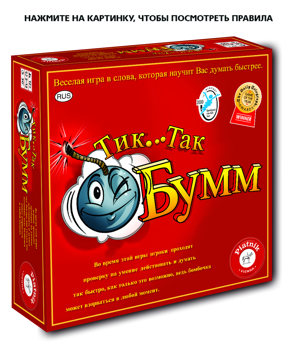 Оставить отзывЦель игры состоит в следующем: каждый из игроков должен стремиться, как можно быстрее назвать слово, в котором есть буквосочетания, представленные на карточке. Если же игрок не успевает назвать слово и «бомба взрывается у него в руках», то эта карточка остается у него. Победителем же признается тот игрок, у кого в конце игры окажется меньше всего карточек.