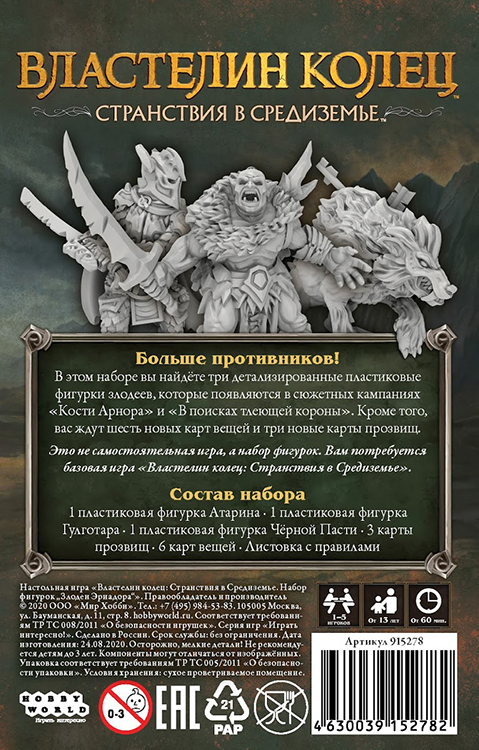 Оставить отзывБольше противников! В этом наборе вы найдёте три детализированные пластиковые фигурки злодеев, которые появляются в сюжетных кампаниях «Кости Арнора» и «В поисках тлеющей короны». Кроме того, вас ждут шесть новых карт вещей и три новые карты прозвищ.