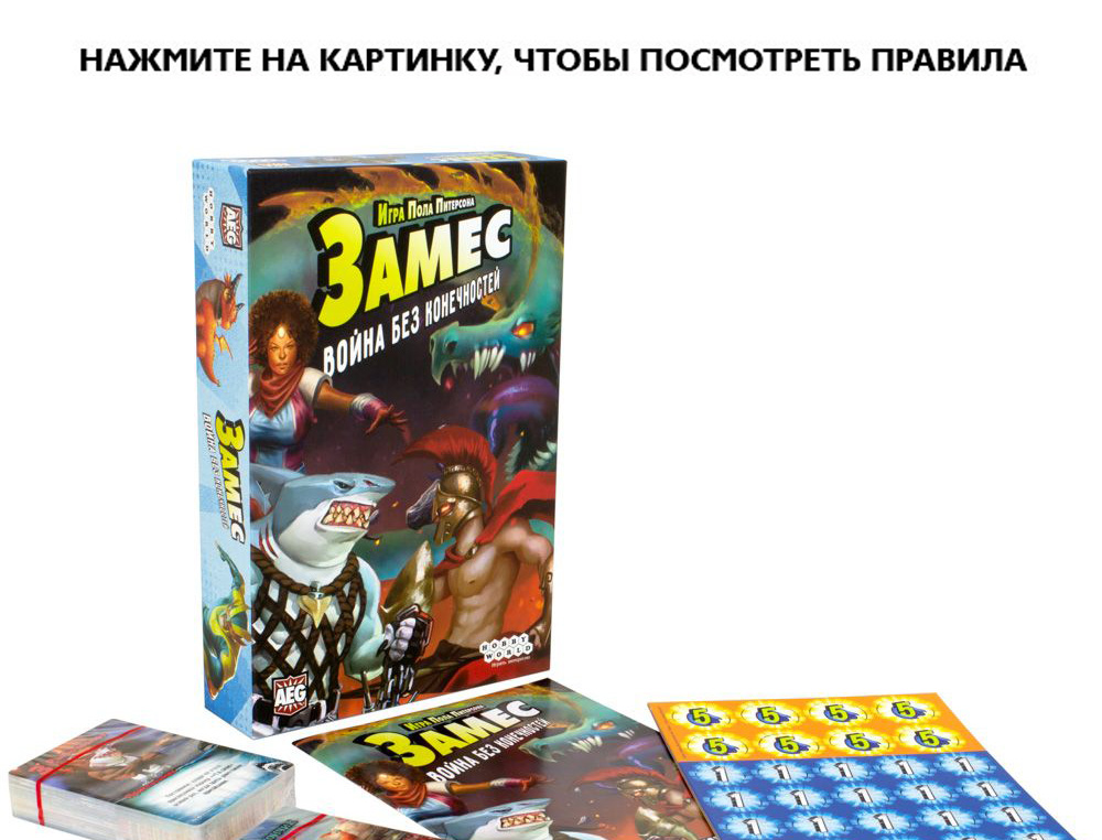 Итак, целых пять новых фракций (есть ещё древние греки! Как мы могли про них забыть?) рвутся на арену дружного мордобоя. Этой компании вполне хватит, чтобы сыграть в «Замес» один на один совсем без базовой коробки. А чтобы замеситься втроём или вчетвером, объедини эту игру с любым другим набором «Замеса» – и погляди, на что способны древнегреческие зомби и акульи котики!