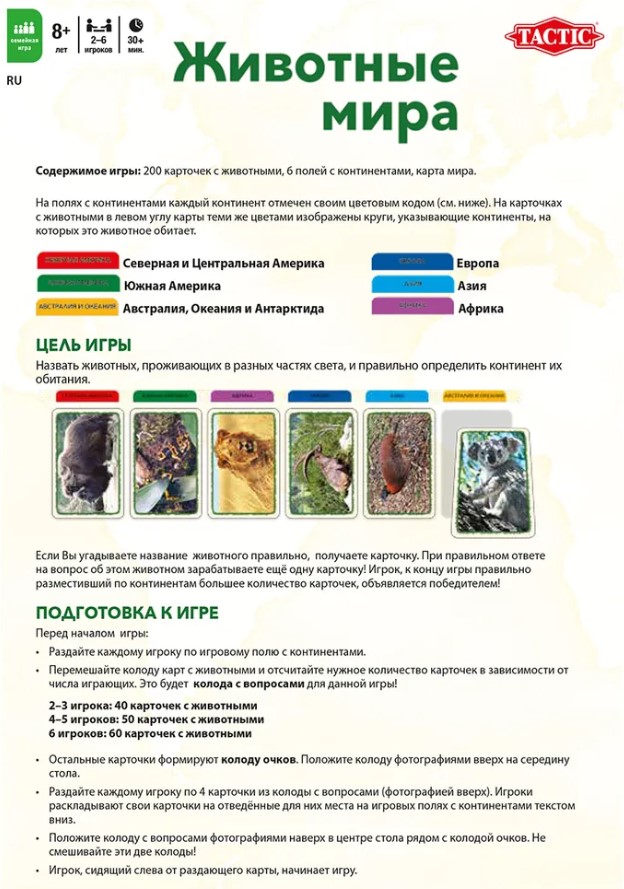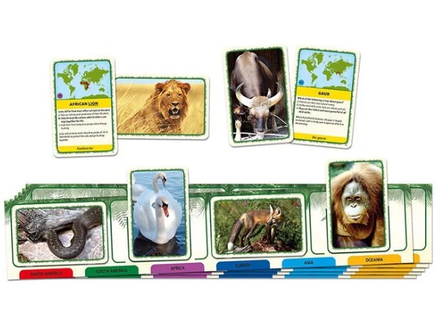 Эта забавная игра-викторина перенесет вас в дикую природу! Совершите кругосветное путешествие, встречайте и узнавайте удивительных диких животных и отвечайте на вопросы о них. Игрок, который разместил больше всего животных на правильных континентах, побеждает! Можно играть в облегченный вариант игры или бросить себе вызов и попытаться запомнить ещё и латинские названия животных. Образовательная и веселая игра для всех возрастов, превращающая обучение в увлекательное путешествие!