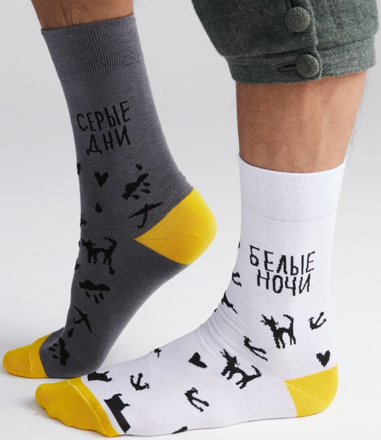 Носки унисекс «Белые ночи, серые дни» с интересным неповторимым дизайном. Модель средней длины с двойным бортом (манжетом резинки) и с обычным швом на мыске – с ощутимым уплотнением.