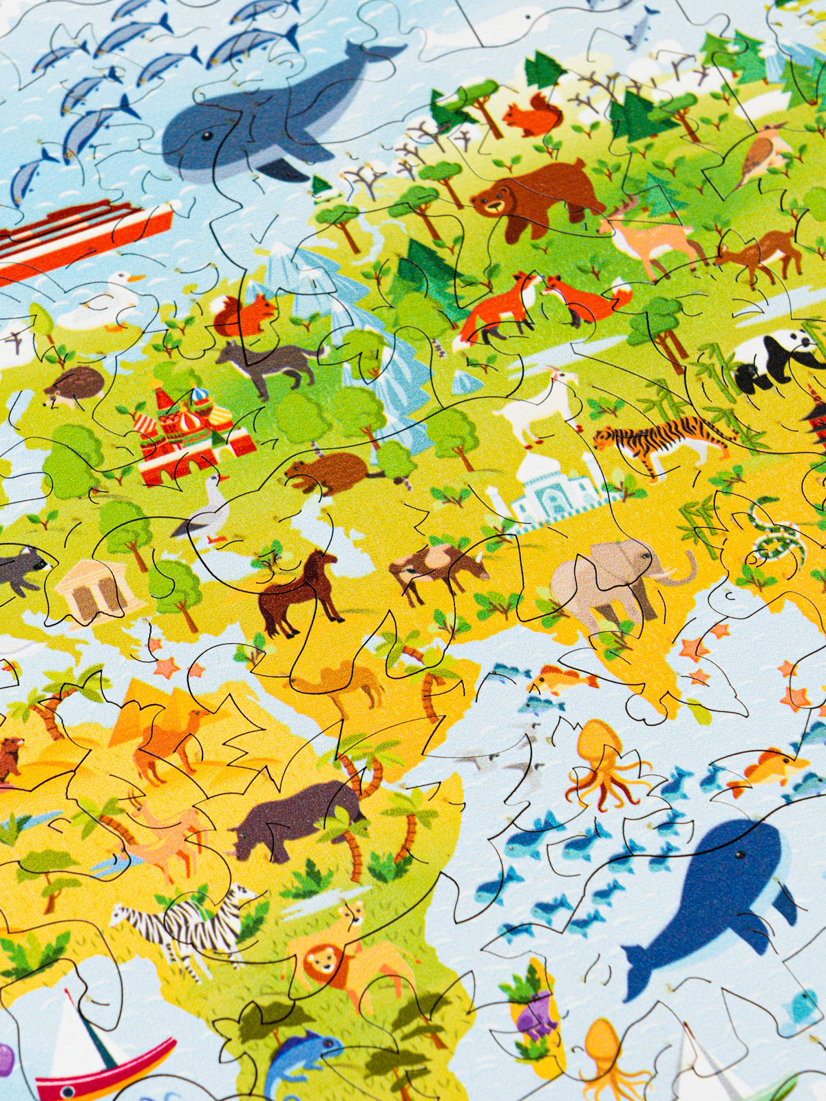 Деревянный пазл «Детская Карта Мира» от компании RUGO – это увлекательная игра, которая позволяет детям изучать географию мира и знакомиться с животным миром. В пазле 100 деталей, которые развивают не только мелкую моторику рук, но и пространственное мышление. Готовый размер изображения 45,8x34,3см, что позволяет ребенку увидеть настоящую карту мира в масштабе.